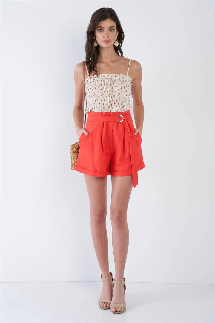 Coral Red High Waist Tie Sash Pleated Cuffed Hem