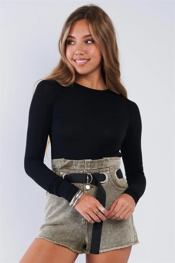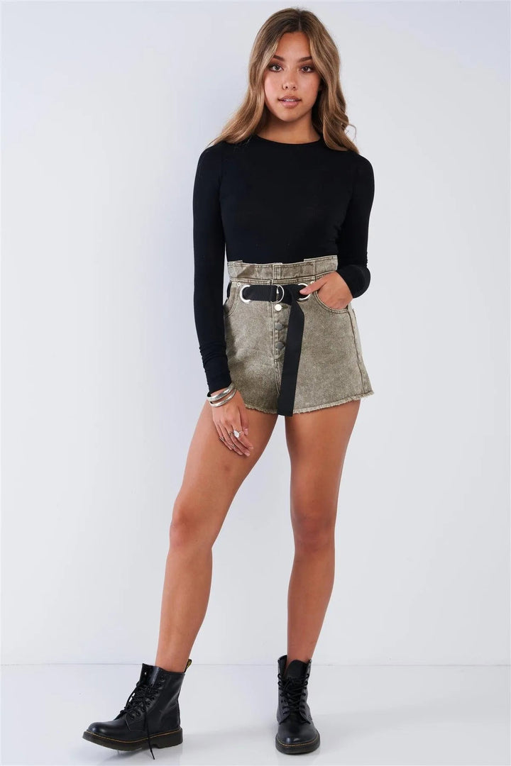 🖤 Short Features: Washed olive denim, high waisted, adjustable d-ring belt, oversized metal belt loops, button up fly, tulip waist hem, frayed hem, front pockets, back pockets, mini length, summer, trendy