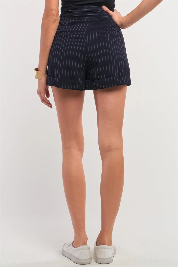 🖤 Item Features: Navy, white pinstriped print, self-tie high-rise waistline, lapeled bottom hem, front hidden zipper closure, unlined, semi-stretch, regular fit, mini length, casual, business casual, office wear, back-to-school vibe, comfy, stylish, trendy, new fall/winter collection