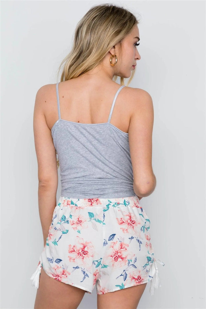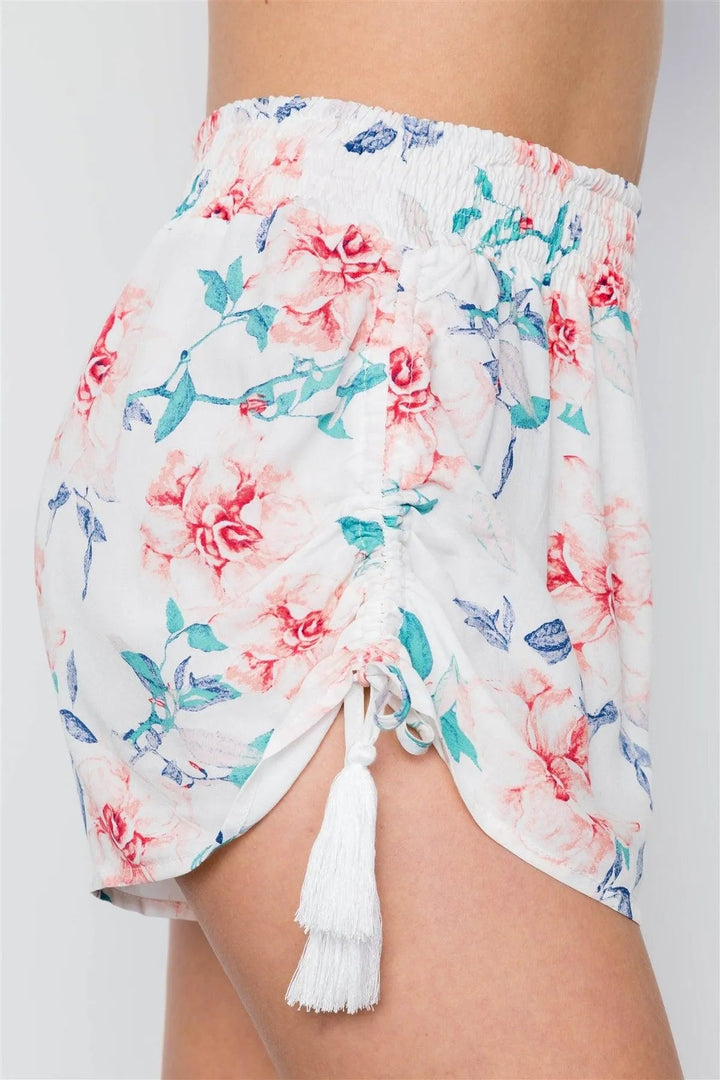 Shorts features: high waist, elastic waist, tie tassle sides, unlined, allover floral print, boho vibes.Model is 5'9" and wearing small (Waist: 28", Bust: 34C", Hips: 36" )Item Measurements: Length: 14", Waist: 30"