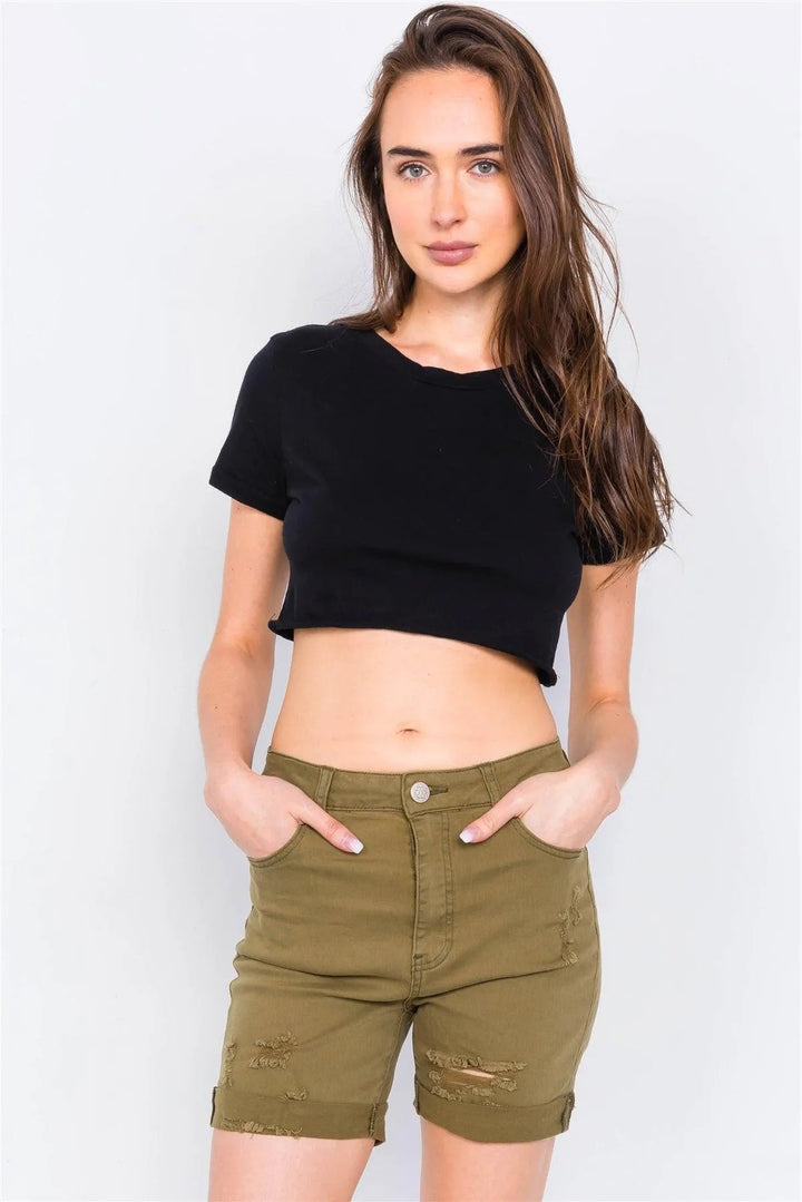 Shorts features: distressed, ripped, rolled hem, midi length, bermuda shorts, sporty, active, athletic, shorts, denim, jeans, solid, side pockets, front zipper and button closure. Model is 5'9 wearing a size Small ( Waist: 26", Bust: 34B, Hips: 36")Item Measurements: Length: 16.5" , Waist: 28"True to size